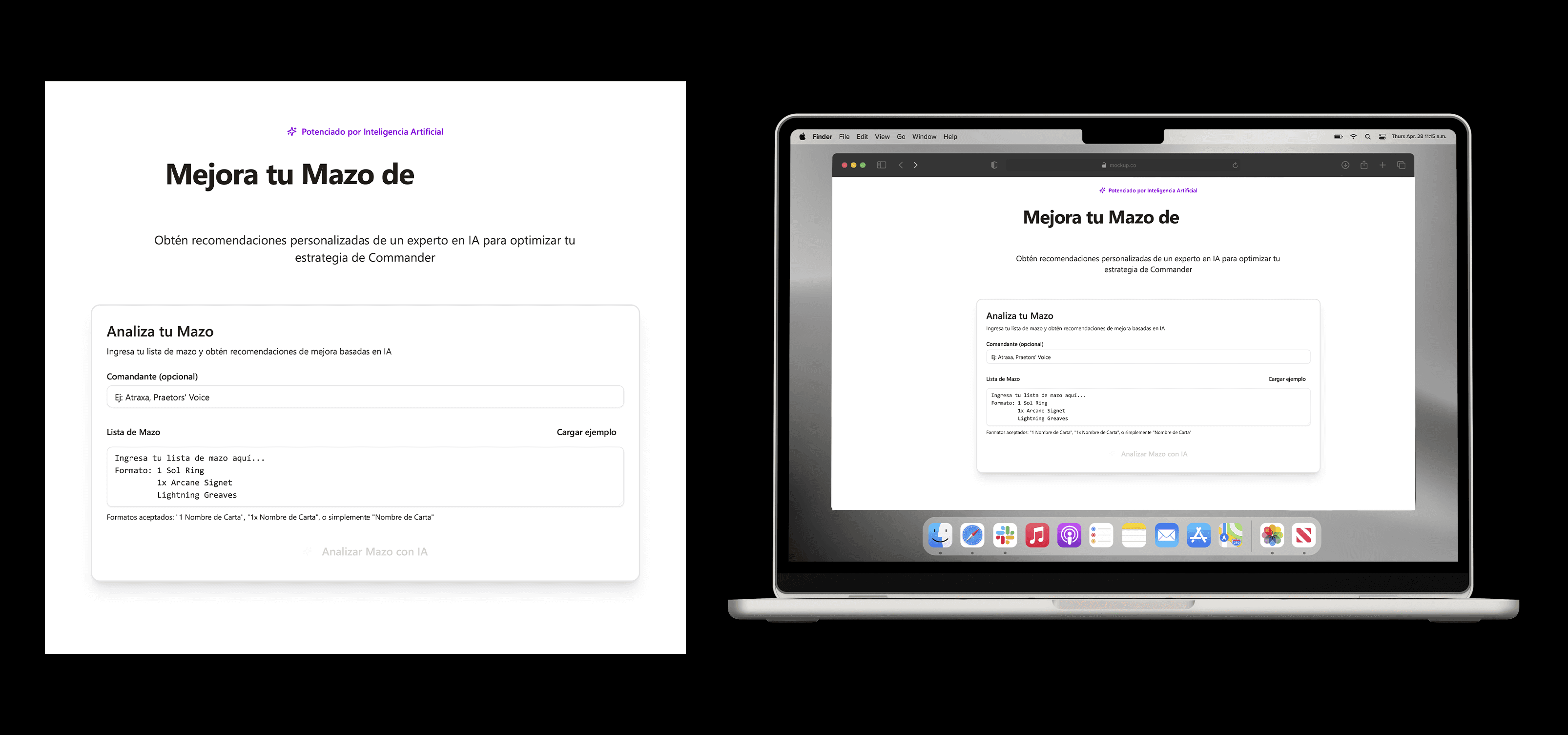 The goal was to create a Minimum Viable Product (MVP): a simple website that takes a decklist and gives back a professional analysis and suggestions for new cards.
